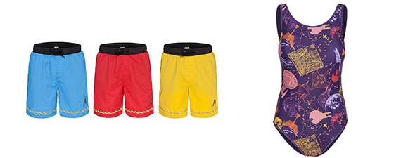 The suits include the Star Trek TOS Swim Trunks, the Star Trek TNG Swim Trunks, and the Star Trek TNG Ships One-Piece Swimsuit.