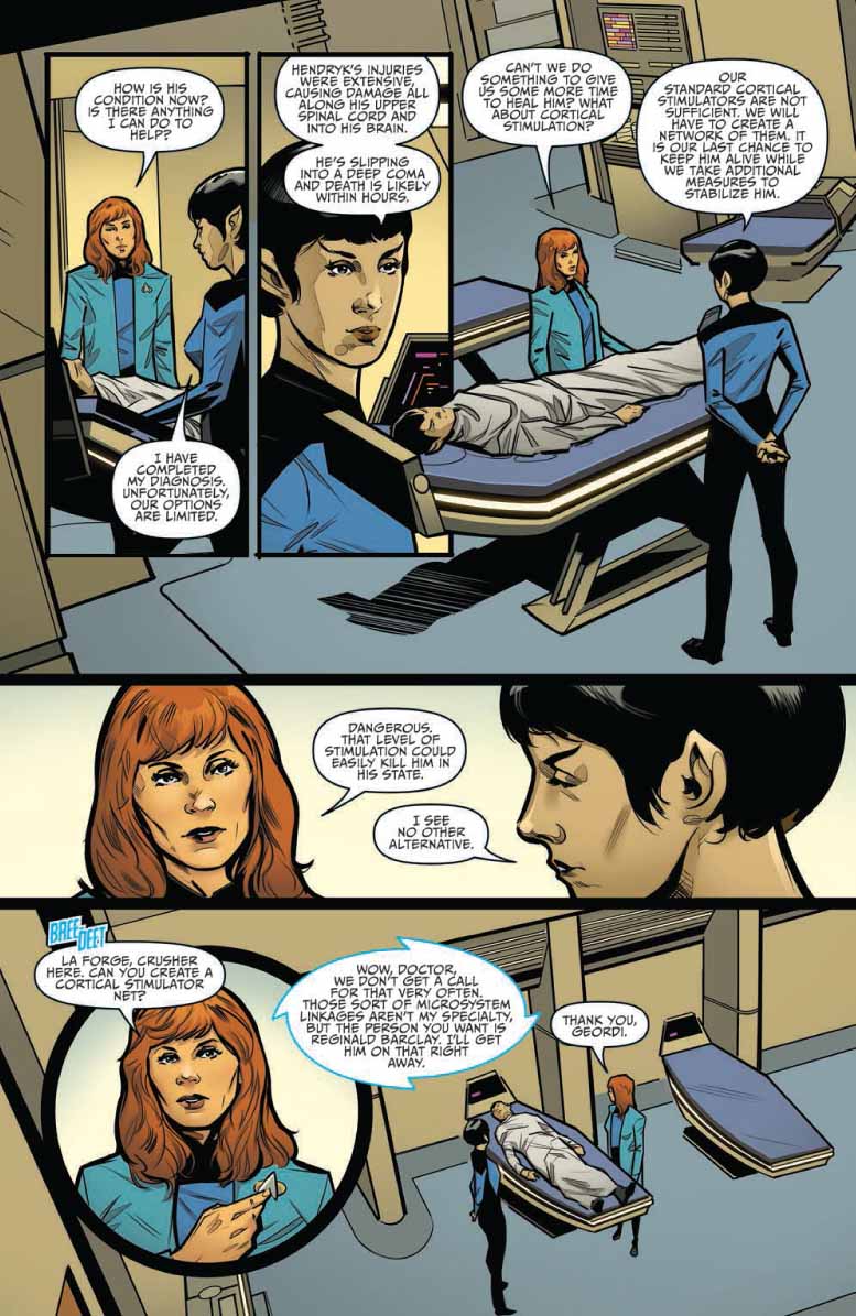 The description of the story in Terra Incognita #3 is as follows: “On the heels of the blockbuster Through the Mirror miniseries comes a brand-new Next Generation series, featuring untold tales of Captain Jean-Luc Picard and the crew of the U.S.S. Enterprise-D! With a high-ranking Federation official’s life hanging in the balance, Doctor Selar faces a difficult decision when she must choose between her responsibility as a physician and her adherence to Vulcan philosophy.”