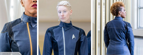 The jacket, which comes in a male or female version, is made of heavy denim with “sturdy topstictching.” It comes in four different colors; gold for Command, silver for Sciences, copper for Operations, and “stealthy black” for Section 31. The badge seen in the photos is not included, but can be ordered at QMx for $14.95.