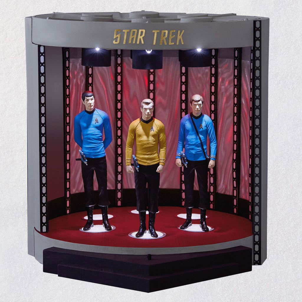 There is one more 2019 Star Trek ornament from Hallmark, and it will make its debut on October 5. The Star Trek The Transporter Tabletop Decoration with Light and Sound features Kirk, Spock, and McCoy on the transporter pads. “Press the button to hear dialogue and sound effects from the original Star Trek television series set to a synchronized light show. Connect to the included power adapter to see the continuous light effect.” And “press the button to hear dialogue from the original Star Trek television series and see a synchronized light show. Plugs into a standard 120-volt wall outlet, no batteries needed.”