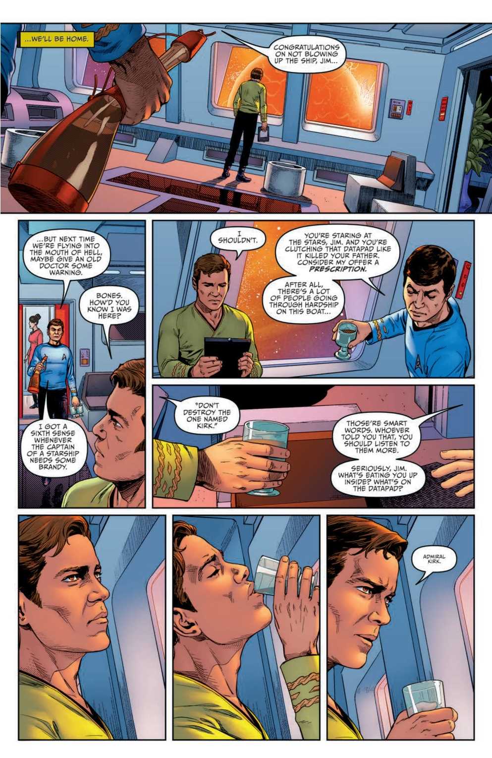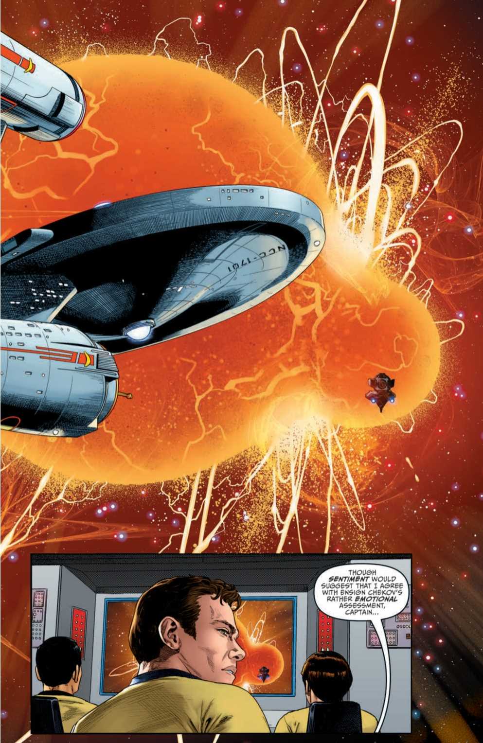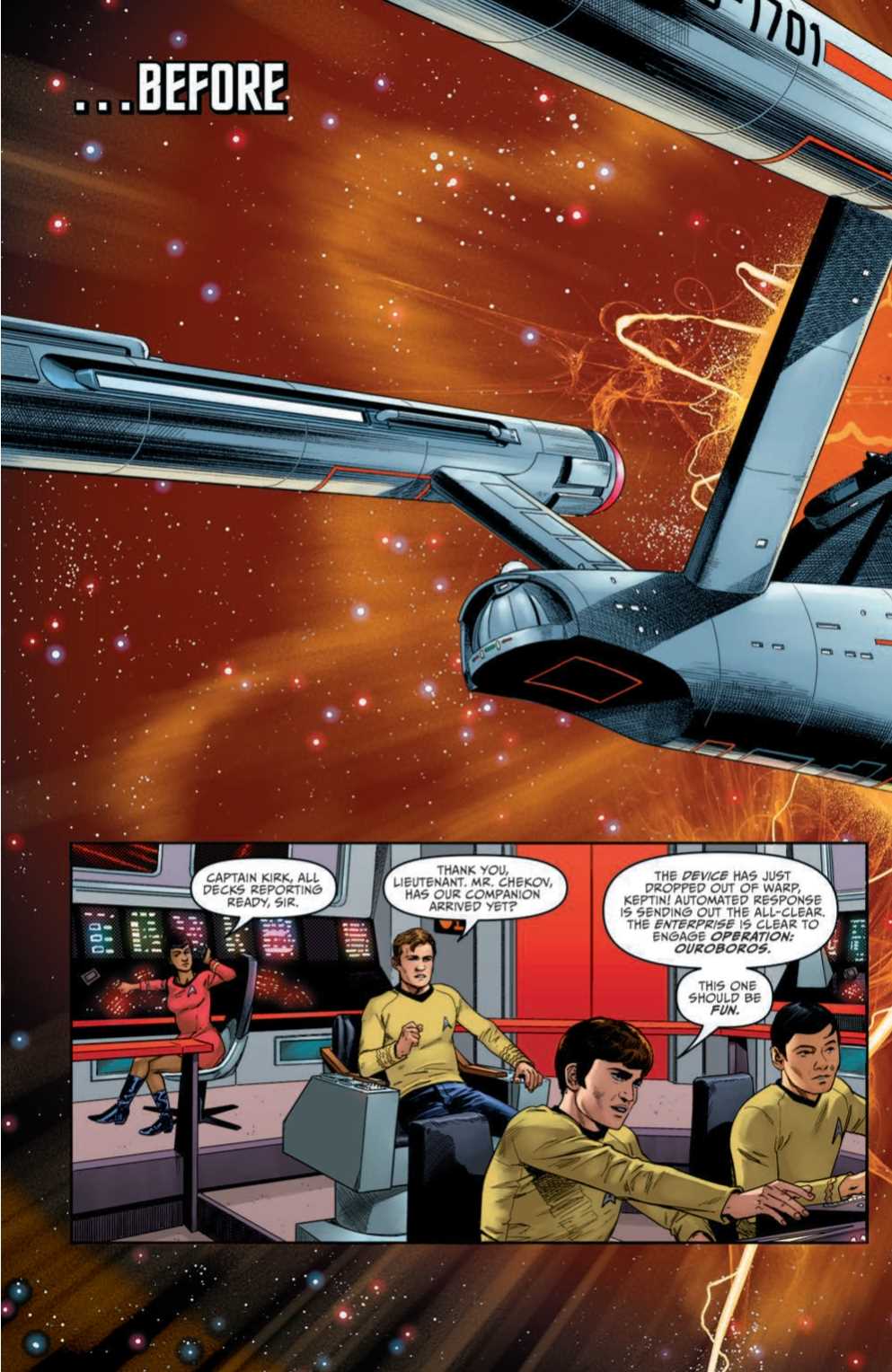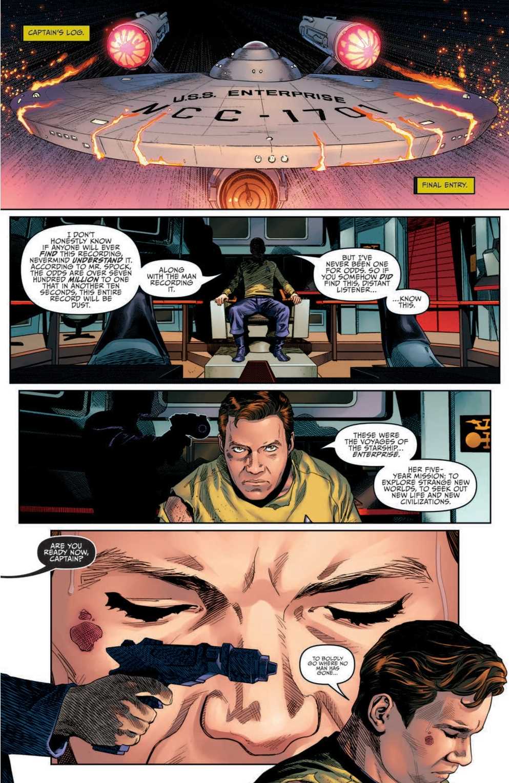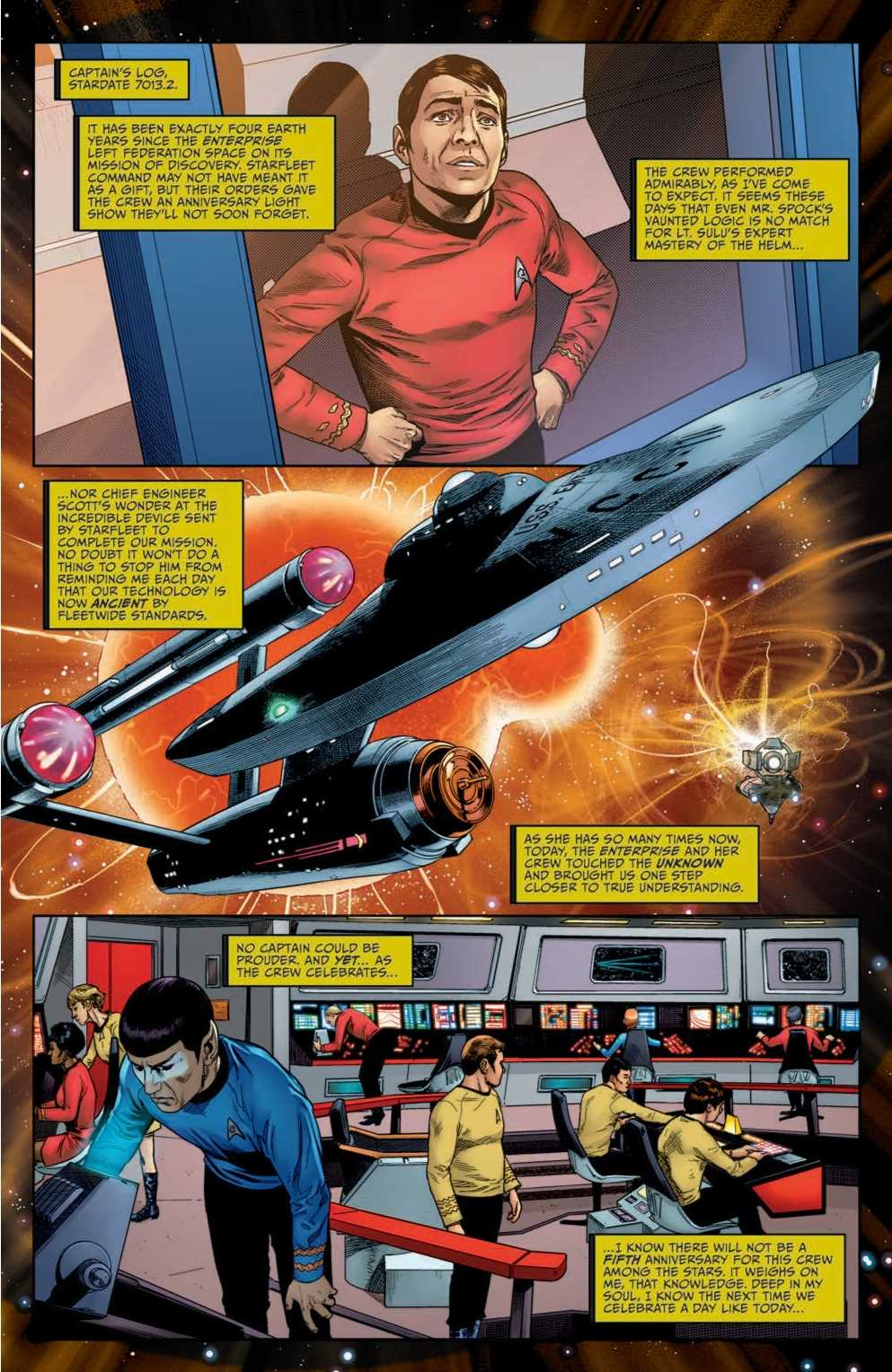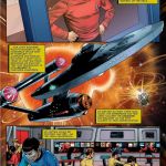 In Star Trek: Year Five “The crew of the Enterprise left Earth four years ago. They’ve traveled to strange new worlds, defeated impossible foes, and made universe-changing decisions. But now, with the end in sight, they’ll have to face their biggest challenge yet. Step aboard the Enterprise with Kirk, Spock, Bones, Uhura, Sulu, Scotty, and Chekov as they begin the end of their original five-year mission and boldly go into an uncertain future in this new continuing Star Trek series! Collects issues #1-6.”