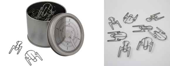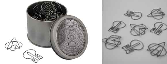 The Star Trek TNG Paper Clips set will be available toward the end of the year. There are two varieties of paper clips; one shaped like the USS Enterprise NCC-1701-D, and the other as a Starfleet insignia. The paper clips are packaged in a “stylish tin can with a lid replicating the saucer of the NCC-1701-D.” Each tin includes forty clips; twenty of each kind. To pre-order your set of paper clips, which costs $25.00, head to the link located here.