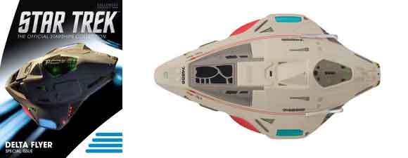 “Improvised in the Delta Quadrant at the urging of Lieutenant Tom Paris, the Delta Flyer was an advanced shuttle that incorporated both Starfleet and Borg technology. Larger than a standard shuttlecraft, the Delta Flyer had retractable warp nacelles, and was more able to handle the hostile environments that the crew of the USS Voyager faced in the depths of the Delta Quadrant.”