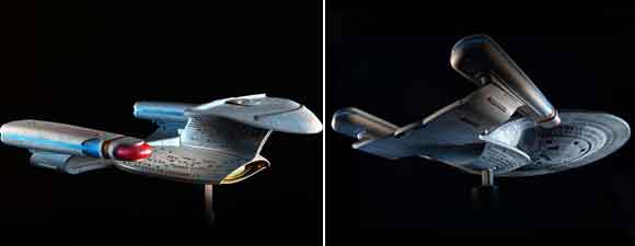 The model is “based on a careful study of the original shooting models. The makers of Star Trek: The Next Generation actually used three different models of the Enterprise-D, all of which were subtly different. ILM built a six-foot version that could separate, and a less elaborate two-foot version that could be used for more distant shots In TNG‘s third season, the VFX team built a new four-foot version that was easier to use.