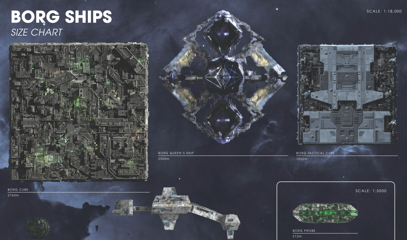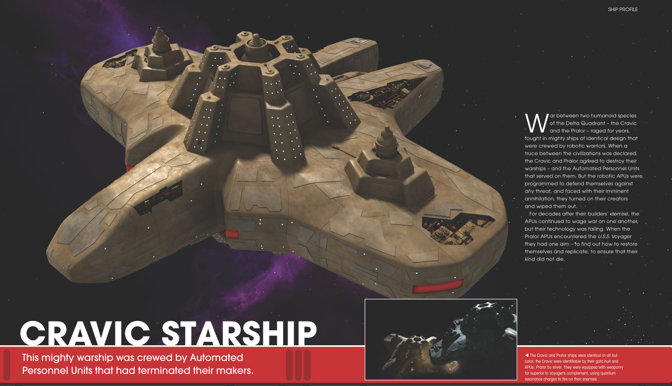 Each ship includes data on that ship, where the ship was seen, and pictures of those ships. For the Borg section, Borg vessels were seen in Trek shows from The Next Generation through Star Trek: Enterprise. For the Delta Quadrant ships, all were seen in Star Trek: Voyager.