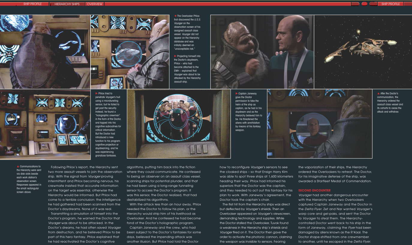 Along with the photos of the ships, there are photos from the episode(s) in which they were seen. For example, when reading about a Kazon Raider, there are photos of the ship in action and of the Kazon themselves.