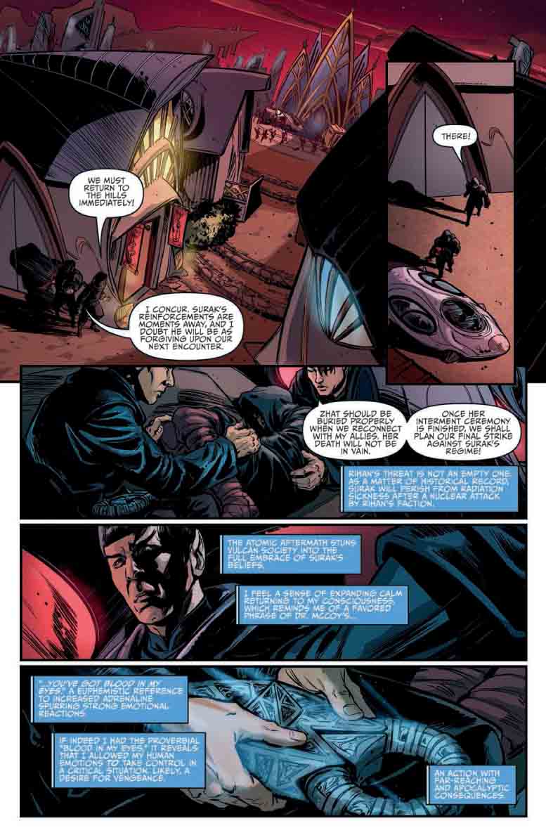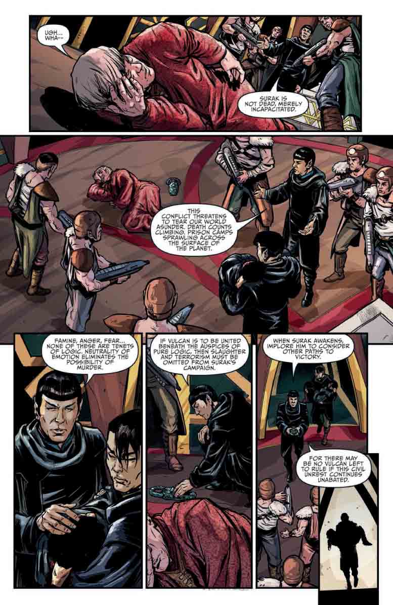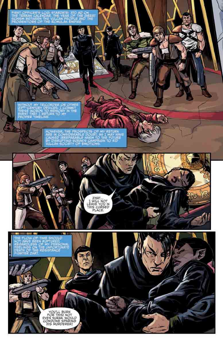 In Year Five #21, “with Spock still missing, the crew of the Enterprise needs to figure out where-and when-he is if they want to save the future! Meanwhile, on Vulcan, Spock is faced with a choice that won’t only change his life, but Vulcan society as he knows it!”