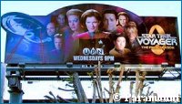 Before Enterprise, this billboard featured a high-tech advertisement for Voyager's final episodes. This banner originally just showed the Voyager ship and logo to the sides, with the center of the billboard hidden behind a veil. Later on, this was removed to show the entire Voyager crew, while special laser effects were also added to the billboard.