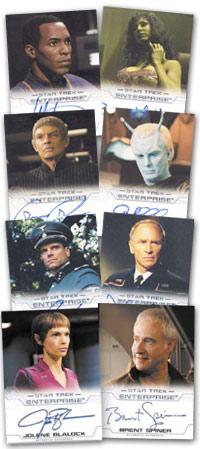 - Sci Fi Hobby has scans of collector cards autographed by cast members from the upcoming Star Trek: Enterprise season four trading card set. Amok Times has more information.