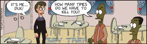 Over at Star Trek: Hypertext, Jamahl Epsicokhan has finally managed to catch up with the actual episodes, having just put up his review of Voyager's 'Alice'. Almost as miraculously, Jammer doesn't seem to hate the episode as much as most of his fellow reviewers did: