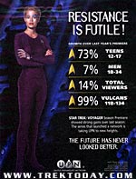 Yesterday's edition of the Hollywood Reporter featured a huge ad placed on the inside cover of the trade paper. In it, UPN tells the world how last week's Voyager season premiere managed to score a 73% ratings increase for teens, a 7% ratings increase for young men, and a 14% increase in total viewership. Oh, and a 99% rise for Vulcans from 118-134 :-). You can find a full-sized version of the ad (which really is quite funny) by going here. Major thanks go out to Jeff 'Koganuts' Koga for the scan!