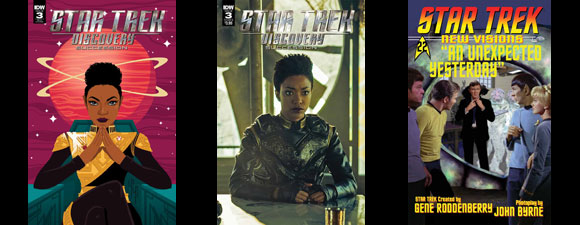 The comics are Star Trek: Discovery: Succession #3, and Star Trek New Visions: An Unexpected Yesterday.