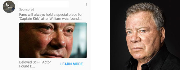 The ad, from Avocet Retail Sales, began with “Fans will always hold a special place for ‘Captain Kirk,” after William was found…” and at the bottom of the ad, “Beloved Sci-Fi Actor Found D…”