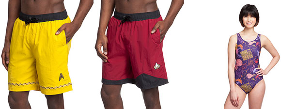 The suits include the Star Trek TOS Swim Trunks, the Star Trek TNG Swim Trunks, and the Star Trek TNG Ships One-Piece Swimsuit.