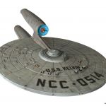 Here is the official press release about the USS Kelvin: “The fan-favorite USS Kelvin, from the opening sequence of Star Trek (2009), is recreated as a precision-tooled, styrene kit. Measuring eleven inches long and seven inches wide, the USS Kelvin model kit is based on actual digital visual effects files. This ‘skill-level 3’ kit includes clear engine details and deflector dish, as well as a Starfleet registry plaque display base. The kit also includes decals and a full-color instruction booklet, including detailed painting tips. Packaging features box art by noted Star Trek production illustrator, John Eaves. (Kit requires paint and cement — sold separately.)