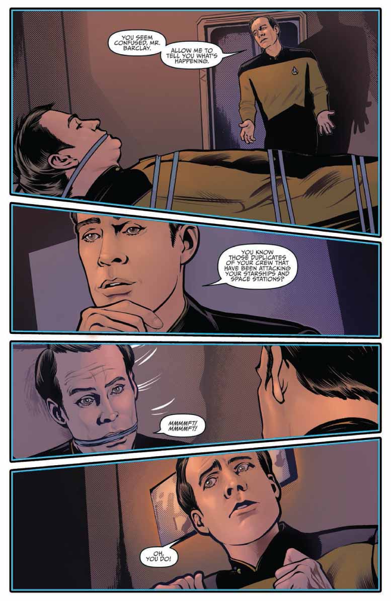 “Following their clash with their villainous doubles from the Mirror Universe, the Enterprise crew returns to business as usual, little realizing the serpent in their midst — one of their own has been replaced! What does Mirror Barclay want, and what’s to become of his Prime-universe counterpart?”