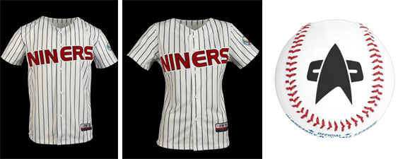 The Niners Baseball Cap replicates “the bold Niners colors on this navy blue hat, as worn by Benjamin Sisko and most humanoid team members. (Klingons and Ferengi wore different hats of different coloration and construction due to cranial size.) This hat features the distinctive Niners team patch replicated from production-used sources, featuring details never before seen from the standard-definition broadcast and improved to be more bold and three-dimensional, while keeping the Michael Okuda’s design.”