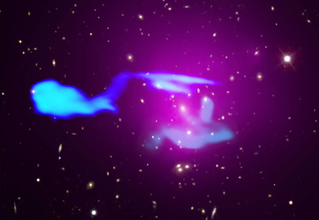 The galaxy cluster in question is named Abell 1033, and includes: x-rays from Chandra (in purple); radio emission from LOFAR, a Dutch Low-Frequency Array; and optical emission from the Sloan Digital Sky Survey. The cluster, which features two galaxy clusters colliding with each other, is located approximately 1.6 billion light years from Earth in the northern constellation of Leo Minor.