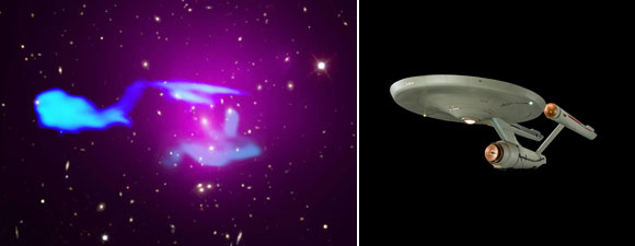 The resemblance to the Enterprise was described this way: “A detailed study of the image shows that the energy of the electrons in the ‘saucer section’ and neck of the starship-shaped radio emission in Abell 1033 is higher than that found in the stardrive section towards the lower left (see labels). This suggests that the electrons have been re–energized, presumably when the jets interact with turbulence or shock waves in the hot gas. The energetic electrons producing the radio emission will normally lose substantial amounts of energy over tens to hundreds of millions of years as they radiate. The radio emission would then become undetectable. However, the vastly extended radio emission observed in Abell 1033, extending over about five hundred thousand light years, implies that energetic electrons are present in larger quantities and with higher energies than previously thought. One idea is that the electrons have been given a further boost in energy by extra bouts of shocks and turbulence.