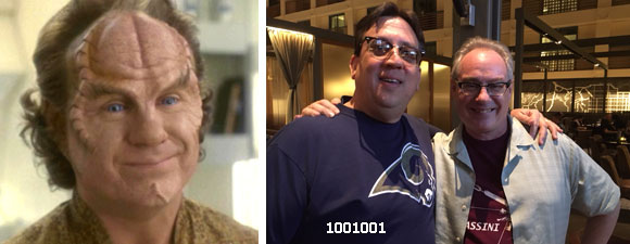 Billingsley: “Winning first prize in the annual Halloween contest, 2001. [I] didn’t show up intending to enter the contest, not my bag, but the focus puller (camera op. position: pulls the camera along for guy shooting) was dressed as a whip-cracking dominatrix and the crew member who was supposed to be her submissive chickened out. I was wearing my Phlox head that day so I asked the costume department to raid the racks, and they found me a leather codpiece, a red rubber ball, a harness, the whole nine yards. The dominatrix (Michelle, I think?) led me onto the bridge, all harnessed up, on a leash. I hopped in the Captain’s chair until she beat me off of it with her cat-o’nine tails. [There was] much mirthful appreciation, and we won first prize. I believe the studio passed some rules about ‘proper and improper choices’ re: production costume contests and the parameters that had to be observed in future years.”