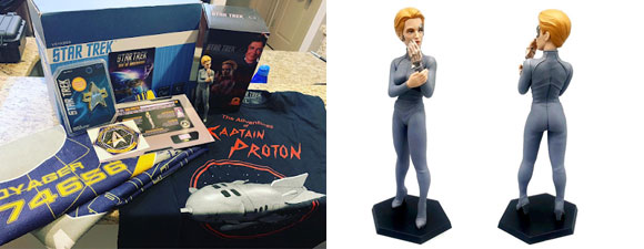 Also included is a Captain Proton t-shirt, a Seven of Nine towel, a QMx Voyager combadge, a Starfleet Command Voyager sticker, and various codes for Star Trek: Online.