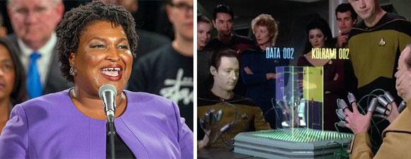 Abrams turns out to be a Star Trek fan, who has watched every Star Trek series. Her favorite captain is Voyager‘s Captain Janeway. Abrams even referenced Trek in her Lead from the Outside book, which is described as “part memoir, part self-help book.” In that book, while explaining her “approach to politics as a black Democratic woman in a state controlled by white Republican men,” several pages refer to Star Trek: The Next Generation: Peak Performance.
