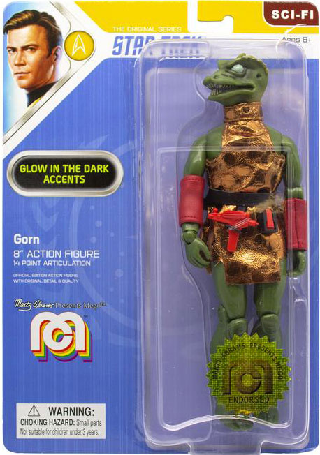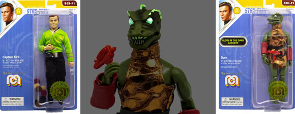The characters are variants of previously released figures, and include a Glow-in-the-Dark Gorn, a Star Trek Captain Kirk in Green Shirt with Tribbles, and a Mr. Spock in Blue Shirt with Tribbles.