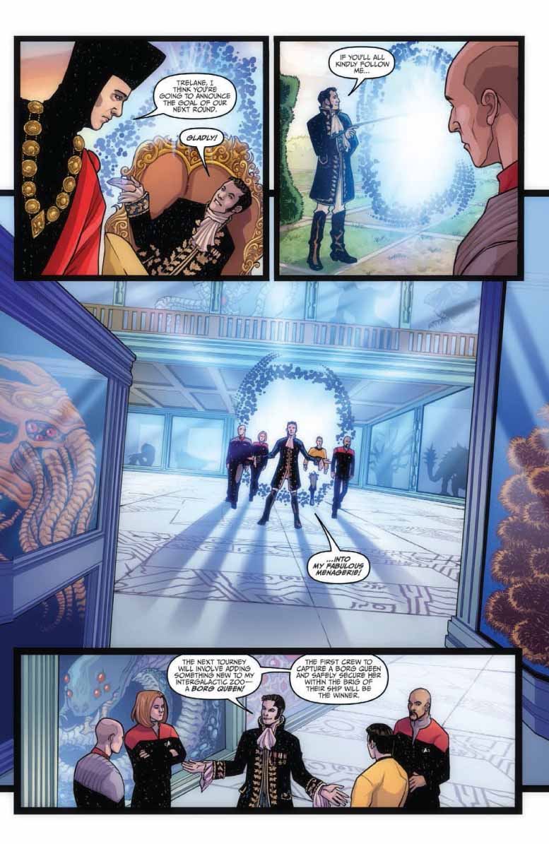 In Q Conflict #5 “The contest for the ages continues as the Captains race to capture the one exotic creature that Trelane is missing from his intergalactic menagerie — a Borg Queen! But as the Godlike beings revel in the games, the crews are hatching a plan of their own. The penultimate issue of the biggest Star Trek crossover of all time!”