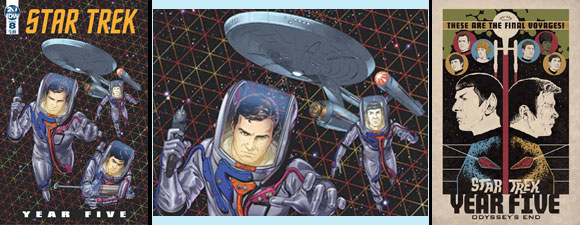 The comics include: Star Trek: Picard: Countdown #1, Star Trek: Year Five #8, and Star Trek: Year Five: Odyssey’s End (Book 1).