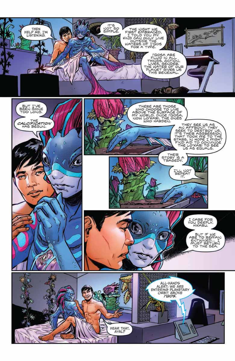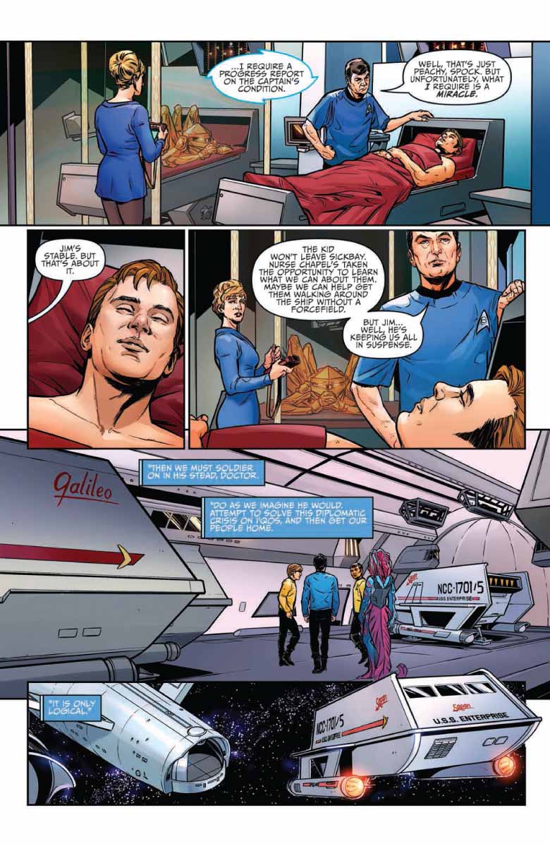 In Star Trek: Year Five #9, “After their close call with the Tholian Assembly, the crew of the Enterprise escorts Ayal back to their home planet, only to find a society teetering on the brink of catastrophe. The final voyages of the original five-year mission continue here!”