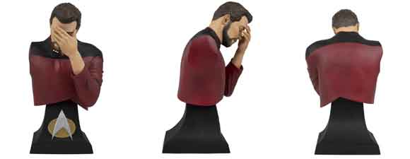 The Riker Facepalm Mini Bust Paperweight, made of polystone and hand painted, is 7.9″ in height, and features a Starfleet insignia on the base of the bust.