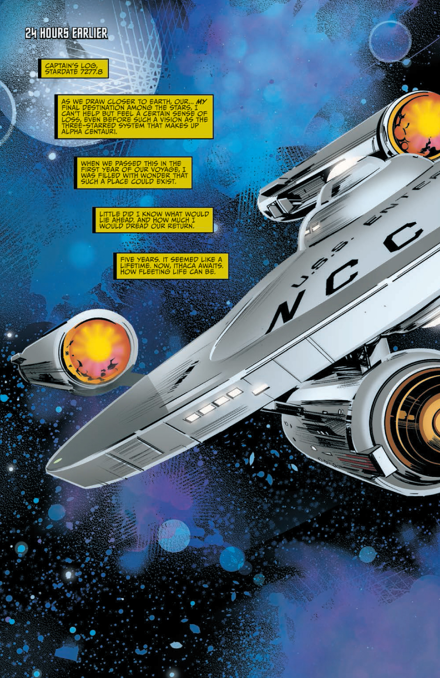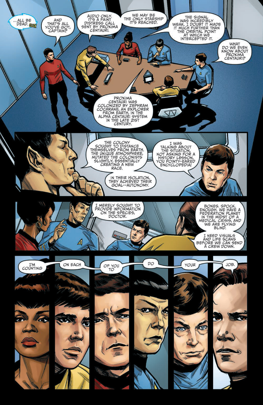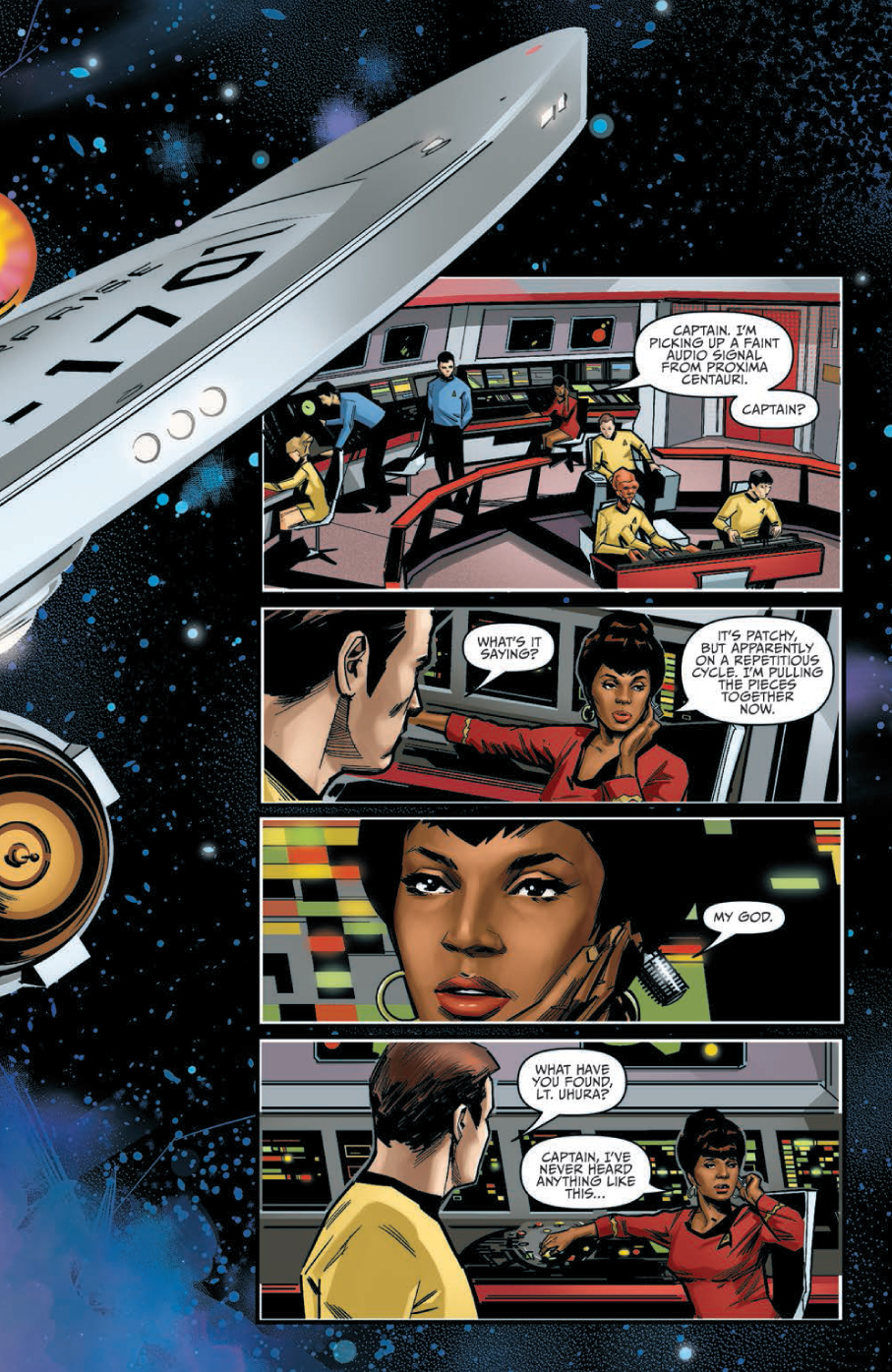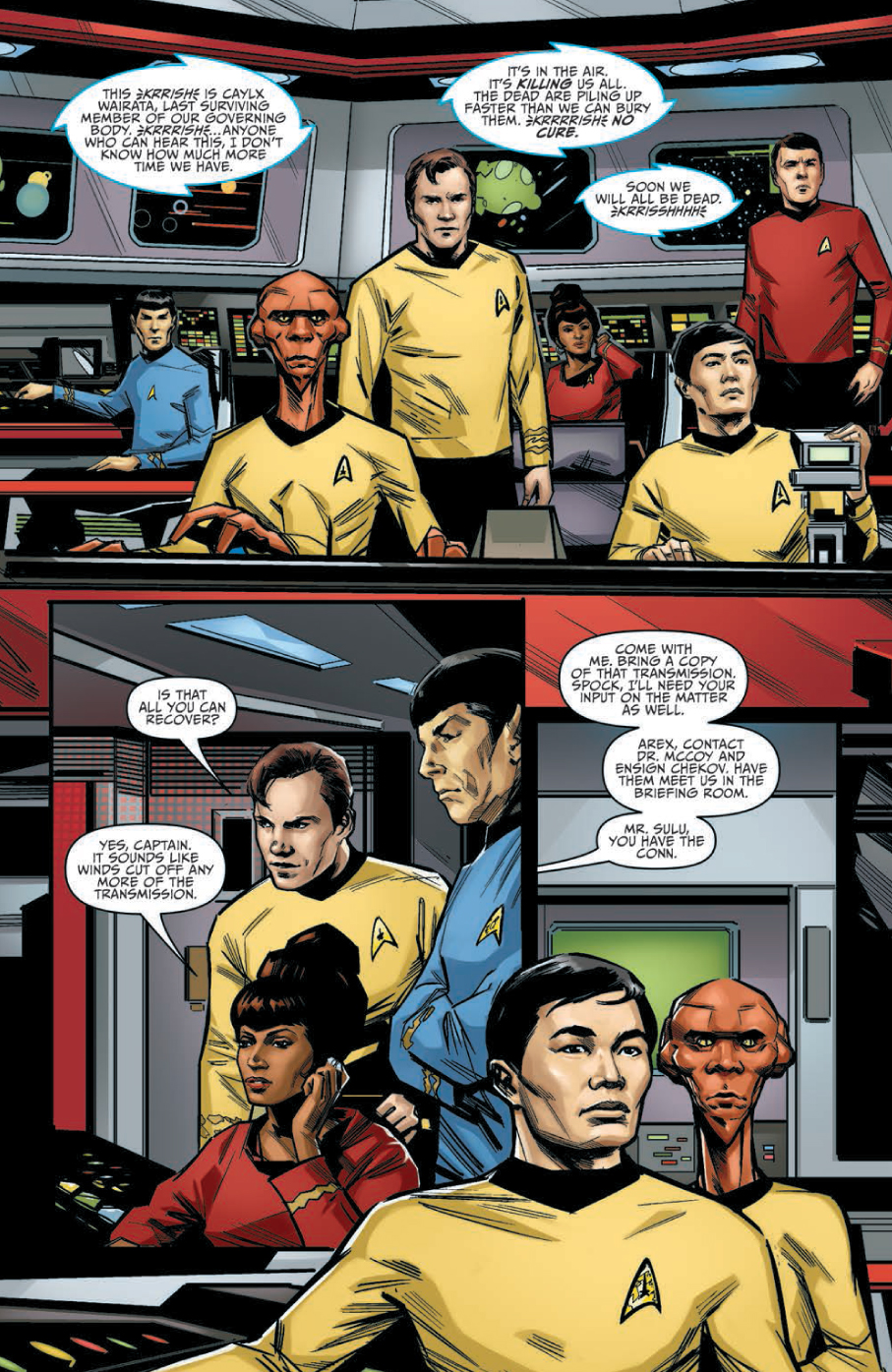 In Year Five #18, “The Enterprise receives a distress call from Alpha Centauri and arrives to find a planet in the midst of a deadly global pandemic. But is nature responsible for this new virus, or is there something more sinister at play?”