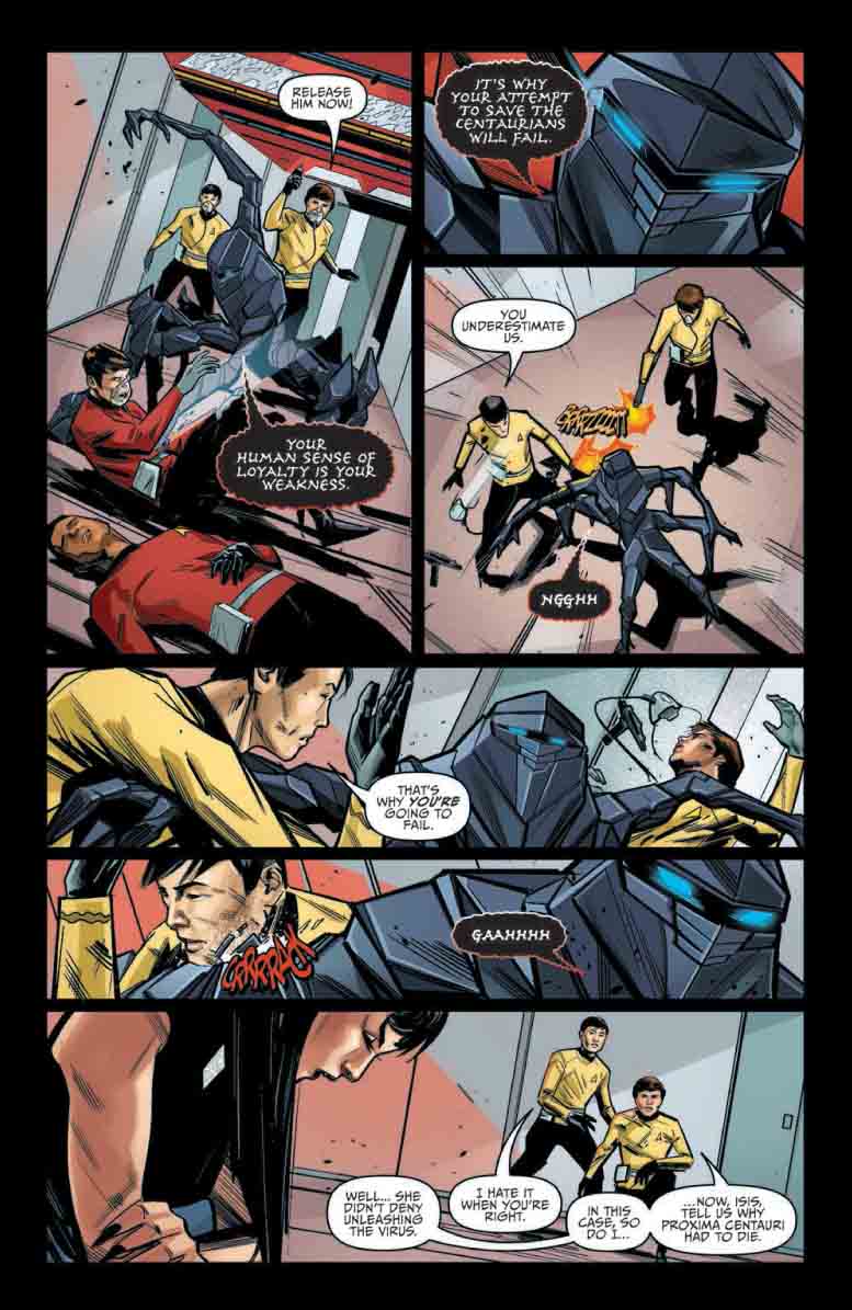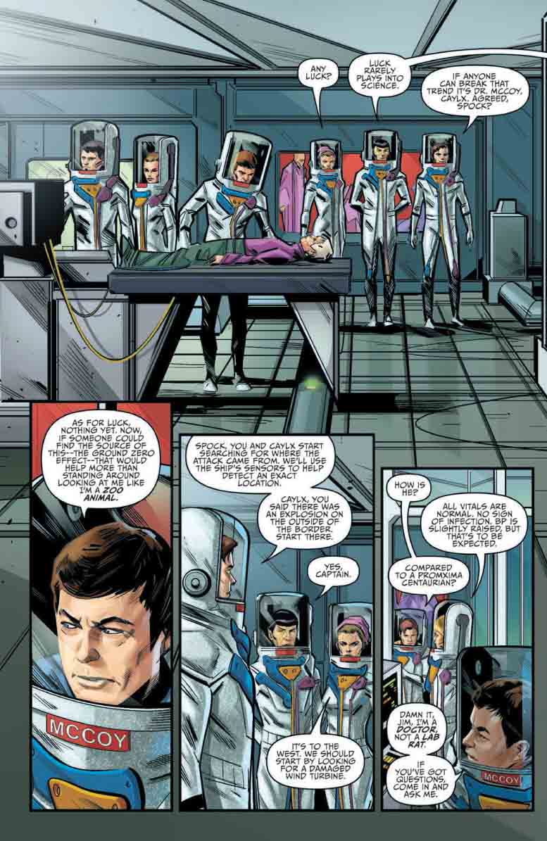 In Year Five #19, “A pandemic raging across Alpha Centauri. A powerful enemy aboard the Enterprise. With death lurking around every corner, the crew will face down one of their greatest challenges yet in the shocking conclusion to this episode.”