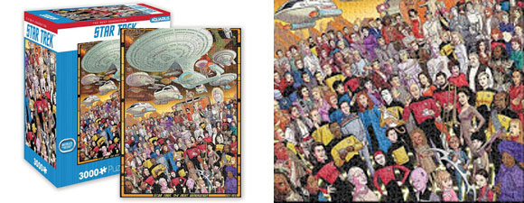 This puzzle contains three thousand pieces and measures thirty-two by forty-five inches. It features artwork by Dusty Abell, and included are Next Generation-era ships, the main Next Generation crew and plenty of guests from various Next Generation episodes. Can you identify them all?