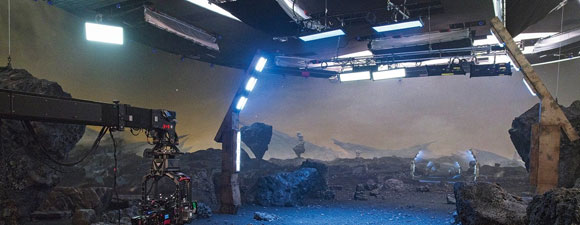 “We’re using Roe’s Black Pearl BP2 2.8mm LED panels for the wall and the Carbon series CB5 5.77mm panels for the ceiling,” said Mahmoud Rahnama, head of studio/VFX supervisor at Pixomondo Toronto. “The ceiling is fully customizable, so we can either take panels out and hang practical lights over the volume, or just use the ceiling’s LEDs for lighting. We have more than sixty OptiTrack motion-capture cameras with the ability to track two cameras — [which are] on Technocranes, Steadicams, dollies and the like — simultaneously.”