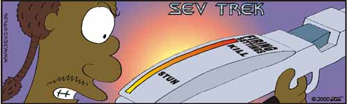Why are phizzers always set to stun or kill. This cartoon lets you invent several other settings for the phizzer rifle. It's also a chance for several winners as we will fit as many of the best entries in as possible (short answers have more chance of getting in).