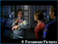 - [Phlox nurses a baby as T'Pol and Archer look on.]